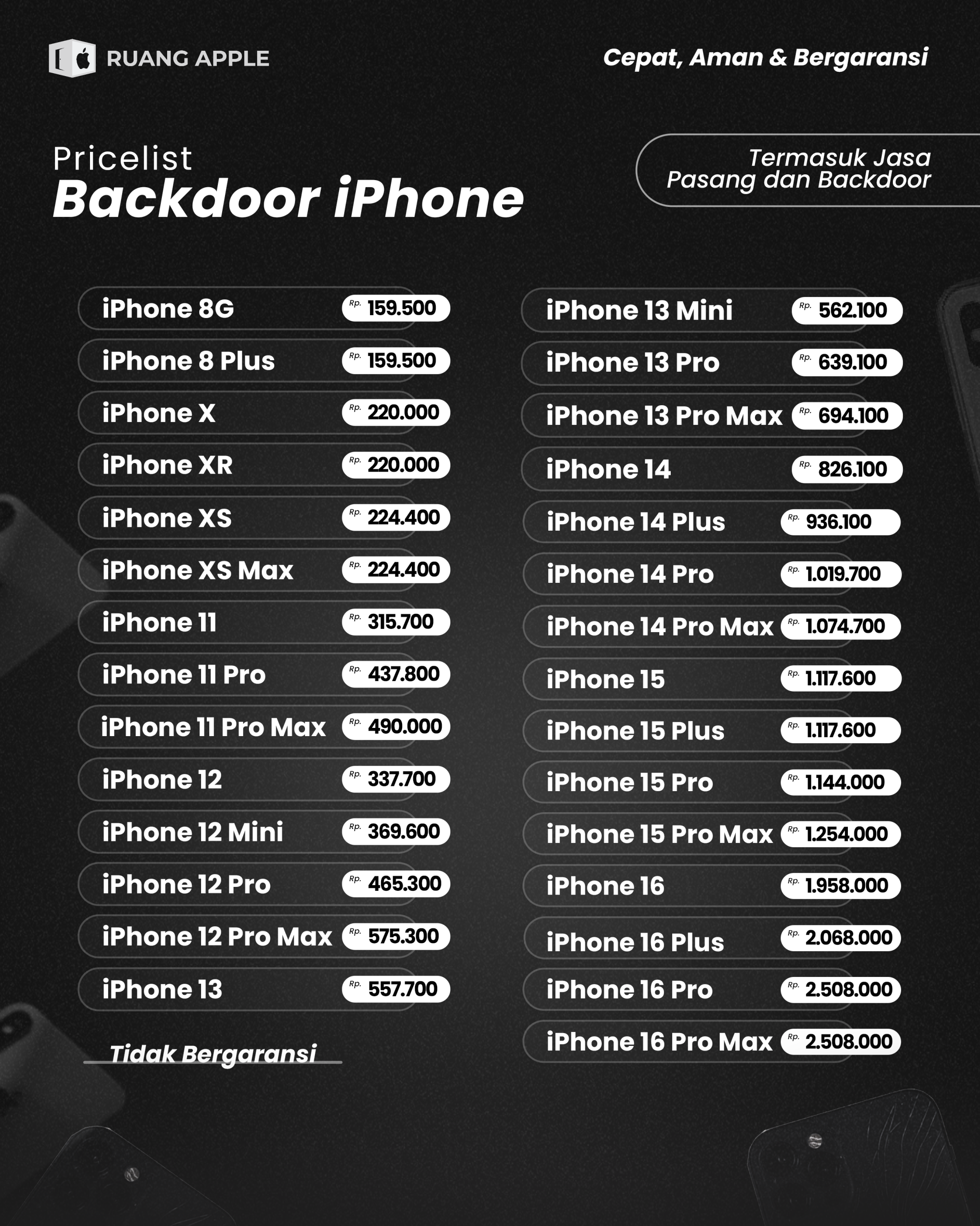 Backglass atau Backdoor iPhone kamu pecah atau sudah retak ? Tenang! Ruang Apple solusinya! Kamu bisa dapatkan Backglass / Backdoor Berkualitas dan pengerjaan bisa ditunggu langsung di Ruang Apple, Backdoor iPhone 8 Series s/d Battery iPhone 16 Series dengan kualitas OEM (Setara Original) dengan harga jauh lebih murah dari tempat lain, harga di atas sudah termasuk jasa pasang dan garansi.