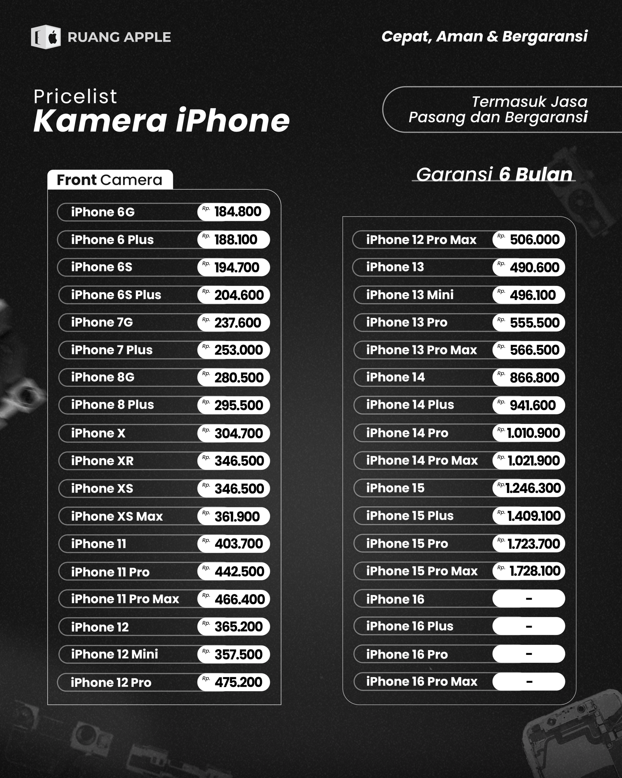 Front Camera / Kamera Depan iPhone kamu bermasalah ? Kami memberikan solusi pergantian modules kamera iPhone 6 – 16 Series dengan harga yang terjangkau, serta dikerjakan oleh teknisi profesional dan sparepart yang bergaransi s/d 6 bulan. Harga di atas sudah termasuk jasa pasang dan spareparts.